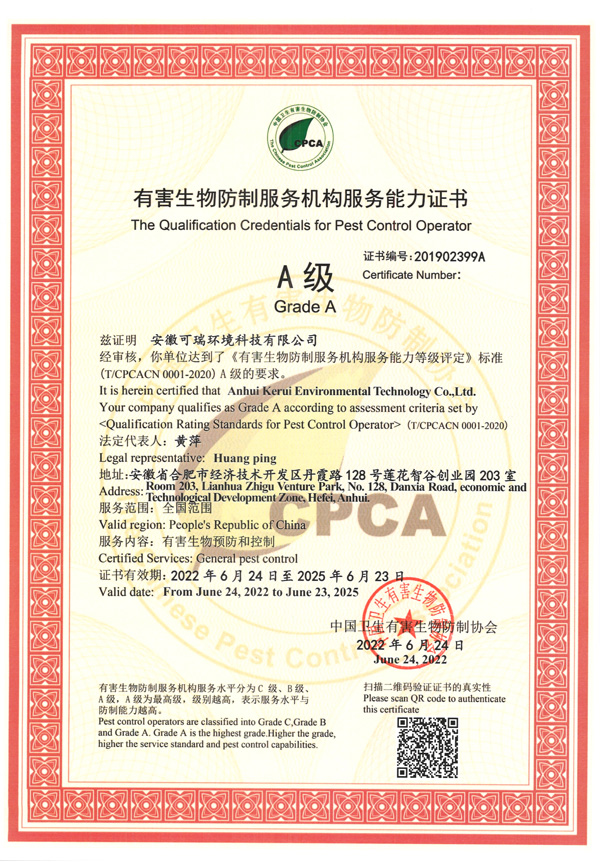 凱瑞蟲控是安徽可瑞環(huán)境科技有限公司旗下品牌,安徽可瑞環(huán)境科技有限公司成立于2014年,注冊資金500萬元,全國A級資質(zhì),致力于蟲害風險管理并提供蟲害消殺、防疫消毒、有害生物防制、蟲害控制管理與監(jiān)測、衛(wèi)生防疫消毒、商業(yè)清洗清潔服務(wù)、空氣治理服務(wù)、環(huán)境綠化施工與養(yǎng)護、藥品和器械銷售、技術(shù)咨詢與培訓等業(yè)務(wù)的服務(wù)性公司。公司是一家有行業(yè)資質(zhì)、注冊商標及專利的公司。我們不參與各種擾亂市場秩序的低價競爭,堅持以合理的價格、新穎的設(shè)備、優(yōu)質(zhì)的技術(shù)、完善的質(zhì)保體系和質(zhì)保措施,來對客戶進行綜合的服務(wù)工作。公司本著...